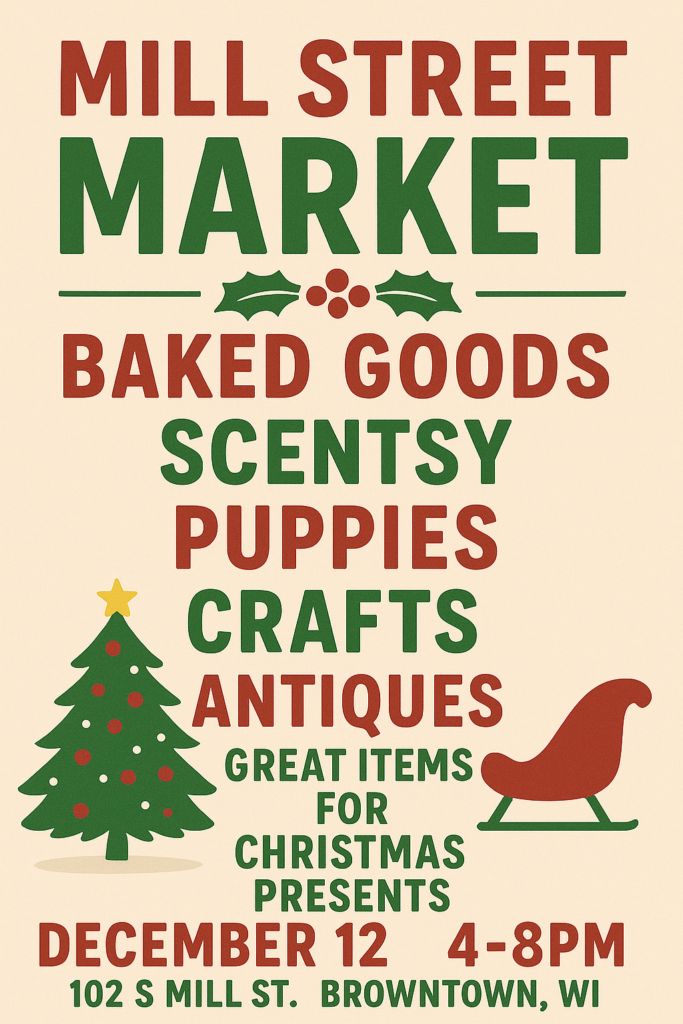 Posted on December 11, 2025, Edited December 11, 2025 by Flor Faustino Mill Street Market – December 12, 2025, 4-8pm 102 S Mill St. Browntown, WI